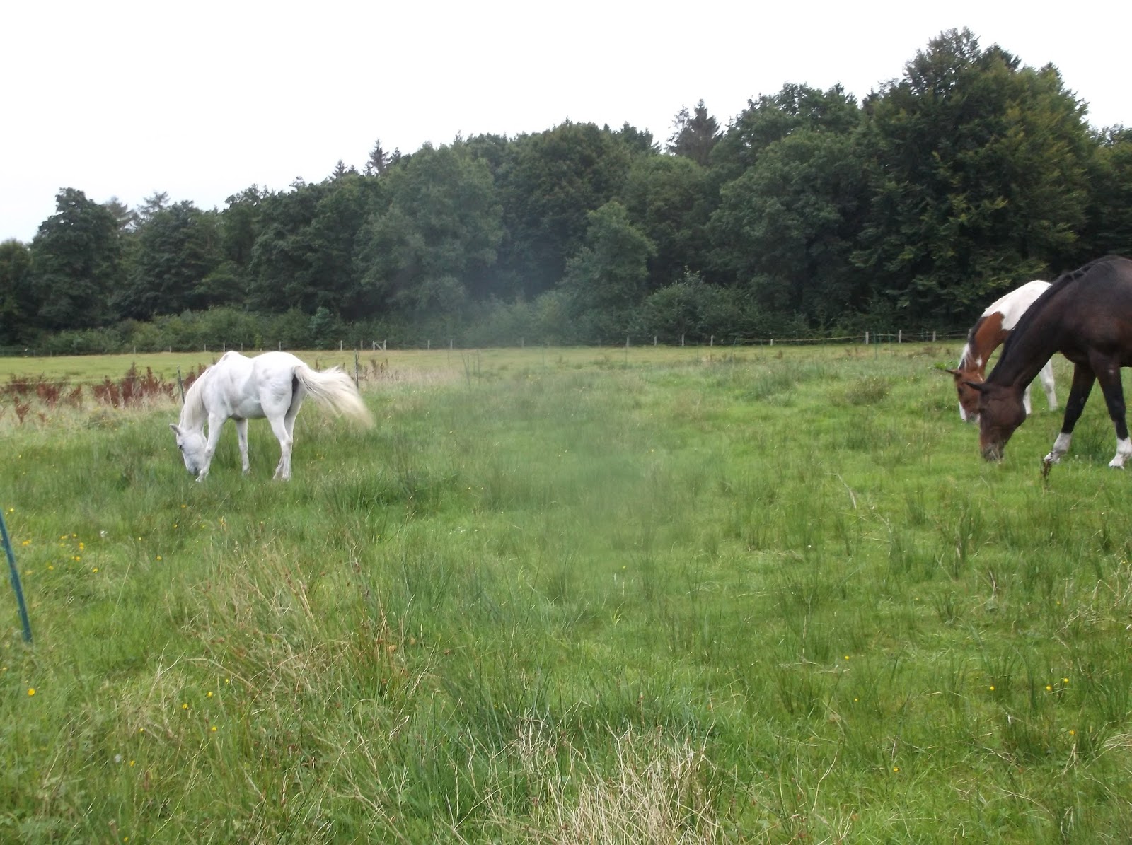 Jürgen hat deshalb heute bei uns alles so umgebaut, dass die Pferde ab heute erstmal bis ca. Ende Oktober nicht in die Nähe der Eichen und der Buche kommen können. Dort, wo sie jetzt sind, gibt es nur Birken und Lärchen. Die sind nicht gefährlich.